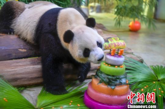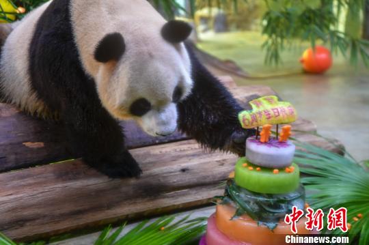 大熊猫准备品尝特制的生日蛋糕。 骆云飞 摄