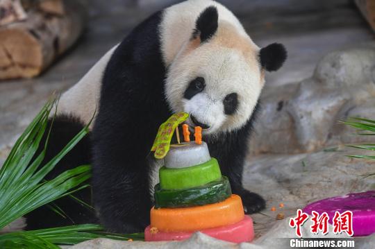 大熊猫品尝特制的生日蛋糕。 骆云飞 摄