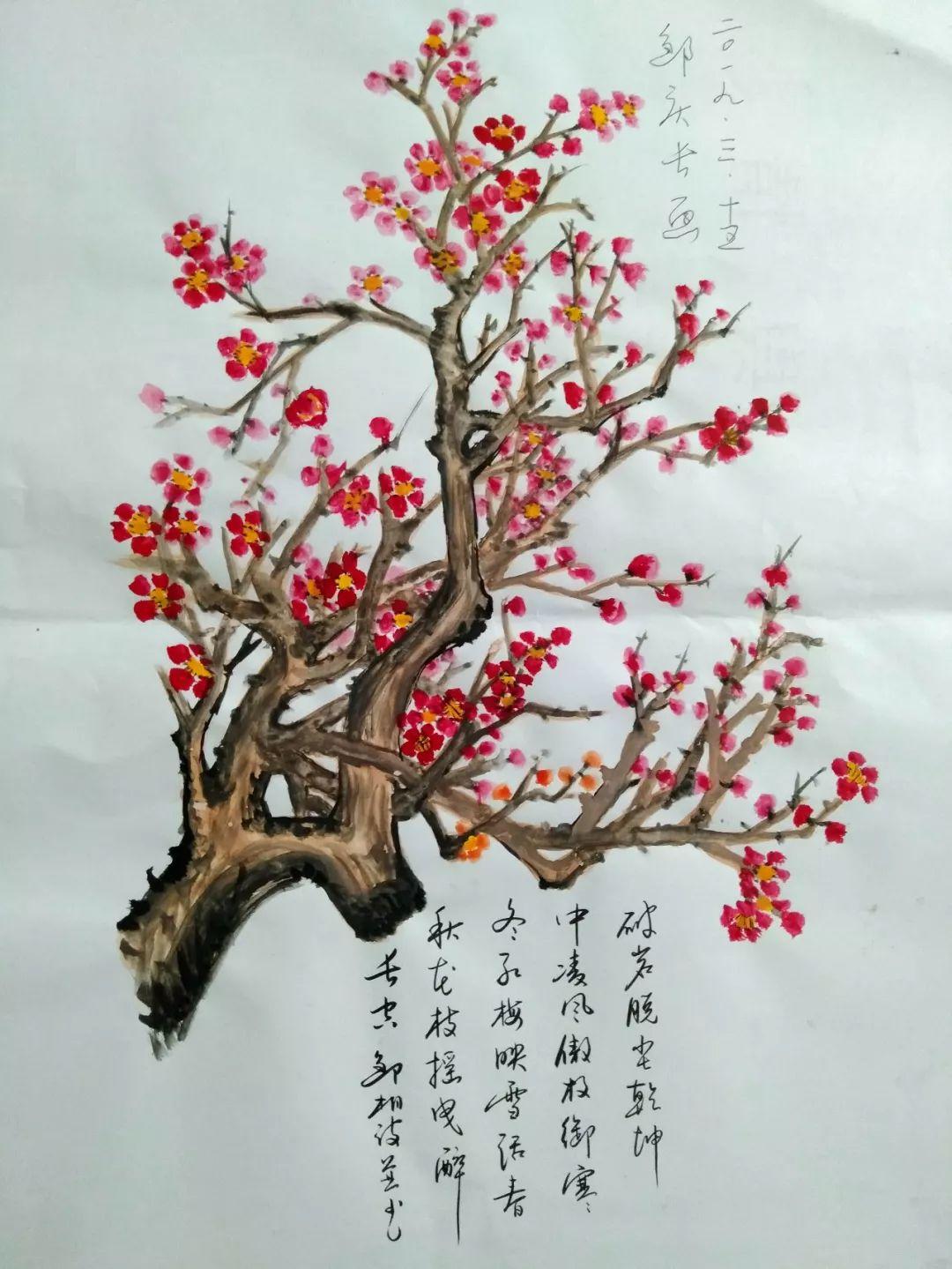 下图的这幅《红梅赞》就是父子俩借所见所感,灵感乍现,提笔而作。图中的红梅美丽动人而苍劲挺拔,有傲雪凌霜之姿。故邹相赋诗赞其“凌风傲放”,一句“藐寒冬”将红梅人格化,赞扬其不屈的风骨。