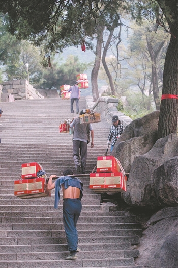 如今,最让赵平江忧虑的是这青黄不接的挑山工队伍。他说,以前泰山边的小学生都会上来挑山,挣个块儿八毛的“勤工俭学”,但现在年轻人都不愿挣这份辛苦钱,人也越来越少。“这算是最后一代挑山工了吧?” 他说,“挑山工可能会慢慢消失,但挑山工精神不会。”