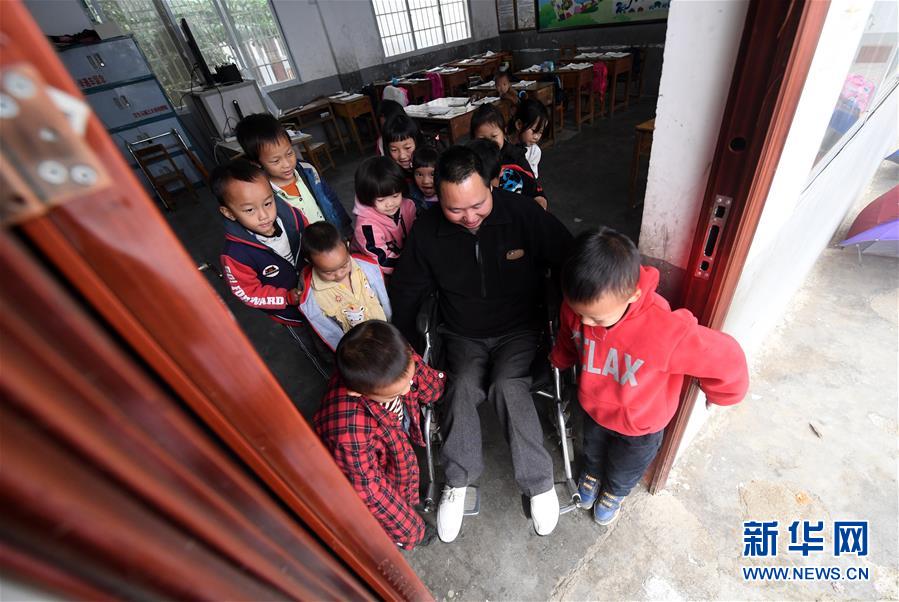 在广西凌云县下甲镇河洲村念恩小学,阮文凭老师下课后在学生帮助下坐着轮椅出教室(3月26日摄)。新华社记者 陆波岸 摄