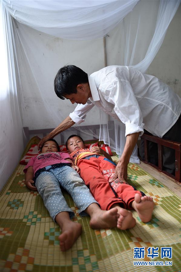 在广西东兰县三石镇泗爷小学,黄英雄老师在照顾学生睡午觉(2014年9月10日摄)。新华社记者 陆波岸 摄