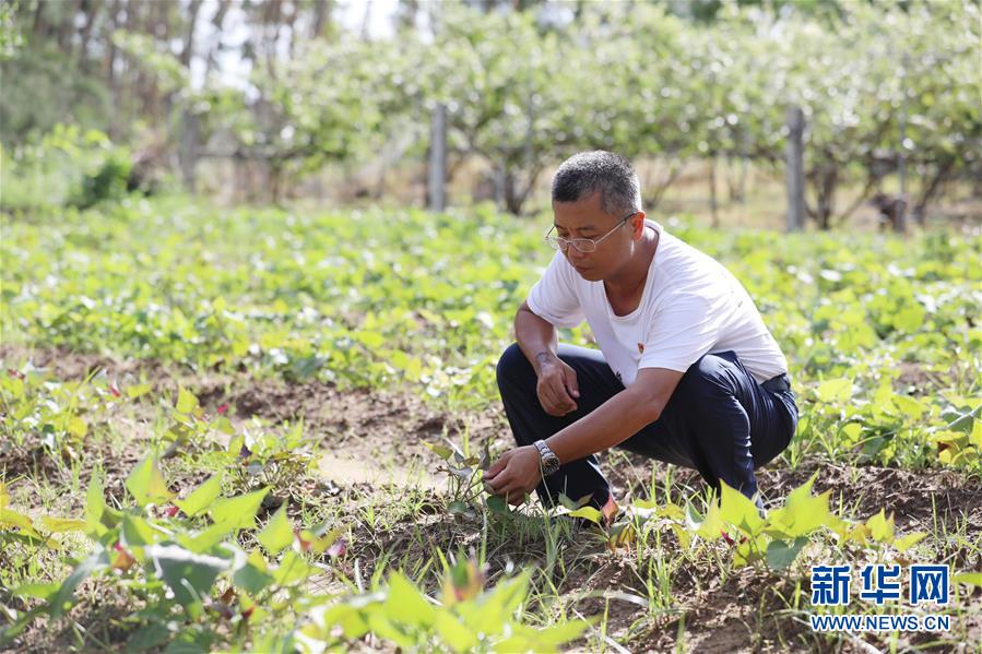 广东省农业农村厅派驻雷州市那毛村党支部第一书记彭彬在番薯地里检查番薯苗的生长情况(8月29日摄)。 新华社记者 李嘉乐 摄