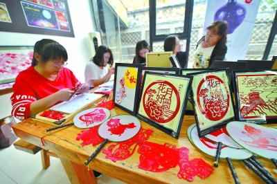 文化体验周活动现场,游客通过制作剪纸、陶艺作品,感受古风古韵。本报记者 潘之望摄