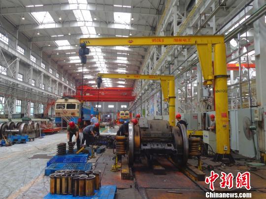 9月13日,太原机务段太北检修车间机械组职工认真解体转向架。 张秋生 摄