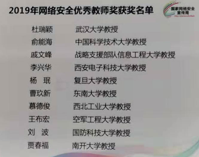 中工网讯(记者 张舒雯) 9月16日,在2019国家网络安全宣传周开幕式上,教育部相关负责人公布了2019年网络安全优秀教师获奖名单,共10名教师获奖。同时公布的还有第二批一流网络安全学院建设示范项目高校名单,分别为华中科技大学、北京邮电大学、上海交通大学、山东大学。