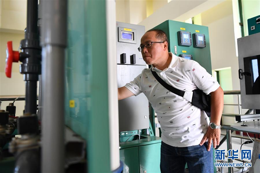 金门县自来水厂技士叶晋良在引水工程阀室内查看设备运行情况(9月16日摄)。新华社记者 陈斌 摄