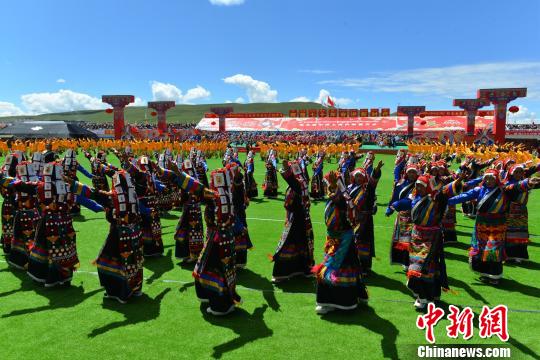 2019年8月10日,西藏那曲牧民参加一年一度的赛马节。图为当地女性组成的大型锅庄舞团队在开幕式上进行表演。(资料图) 江飞波 摄