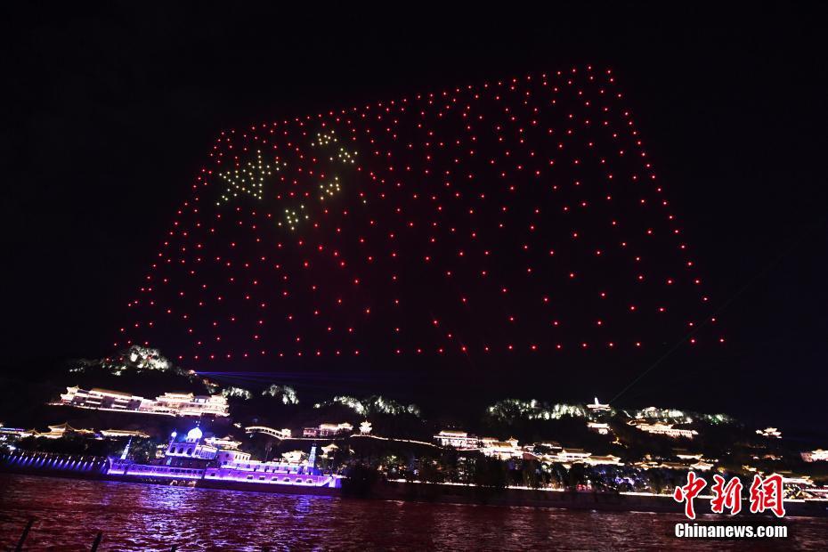 9月25日晚,兰州首届“黄河之滨音乐节”开幕式上,500架无人机拼起巨型“五星红旗”。中新社记者 杨艳敏 摄
