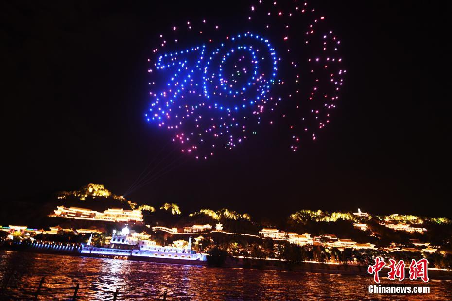 9月25日晚,兰州首届“黄河之滨音乐节”开幕式上500架无人机拼起“70”字样迎接国庆。中新社记者 杨艳敏 摄