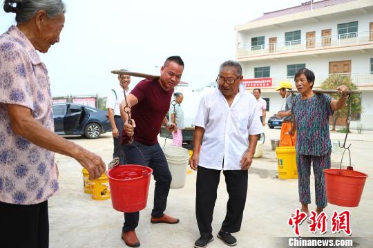 当日,中新网记者赶到余江区平定乡洪万村山底小组时,一辆摩托三轮车满载两大桶清水而来,早已在村口等待的村民们忙着用自家扁担和水桶接水挑回家。