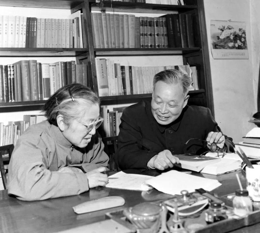 女科学家何泽慧(左)和她的丈夫、科学家钱三强在一起研究有关学术问题(资料照片)。新华社发