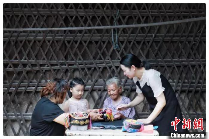 笔、布、剪刀、纸、针、绣线……对俞荷妹来说,像是陪伴多年的“老伙伴们”,只要相互“确认眼神”,便能彼此合作复原画样、穿针、绣花等诸多狮子帽制作工艺。