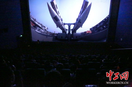 11月15日,中国飞航技术研究院组织130余名职工赴长阳万达影院集体观看新闻纪录影片《此时此刻·2019大阅兵》。(通讯员封晓东 刘湘威 中工网记者徐新星)