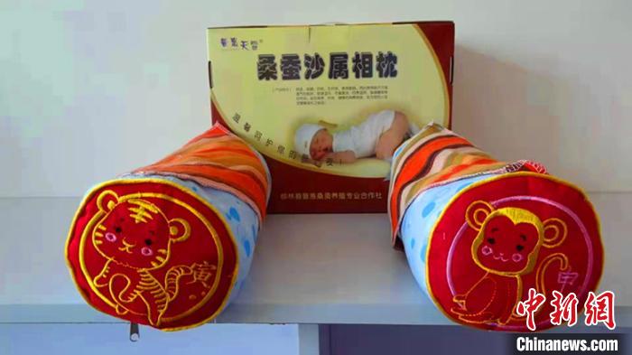 李天柱利用养蚕所剩的蚕沙(蚕粪)开展蚕沙蚕丝保健药枕加工。受访者供图