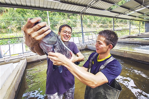 福建省淡水水产研究所的科技特派员薛凌展(左),已连续6年驻点顺昌兆兴鱼种养殖有限公司,负责国家大宗淡水鱼产业技术体系项目及淡水名特优经济鱼类研究开发工作。 朱 宇摄(中经视觉)