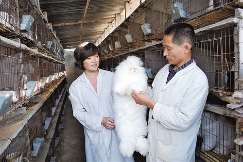 山东省蒙阴县坦埠镇南极山村长毛兔养殖户冯加营和妻子在查看长毛兔生长情况。 张圣虎摄(中经视觉)