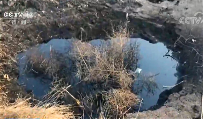 央视记者王帅南:“在我眼前的这条大部分干涸的沟位于煎茶铺镇田家口村村北,在这个沟里有一个比普通圆餐桌要大两圈的坑,坑里边的水体颜色是一个深黑色,而坑周边的泥土全是黑的。”
