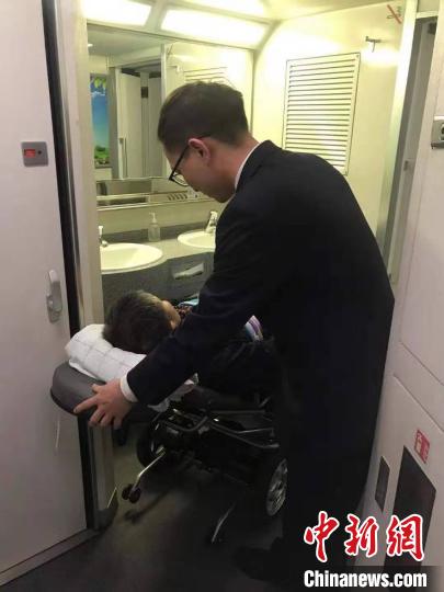 1月16日,D3844次列车抵达楚雄站后,刘女士推着一位坐轮椅的老爷爷准备上车。列车员练有慧见状,立马过去帮忙推进车厢。据悉,老爷爷去年盆骨受伤,不能站立和随意挪动,由女儿陪同从广州南到楚雄寻医治疗,现治疗完要回广州。因轮椅体积大,且移动不便,练有慧综合考虑后,安排老爷爷到洗脸间处落脚。
