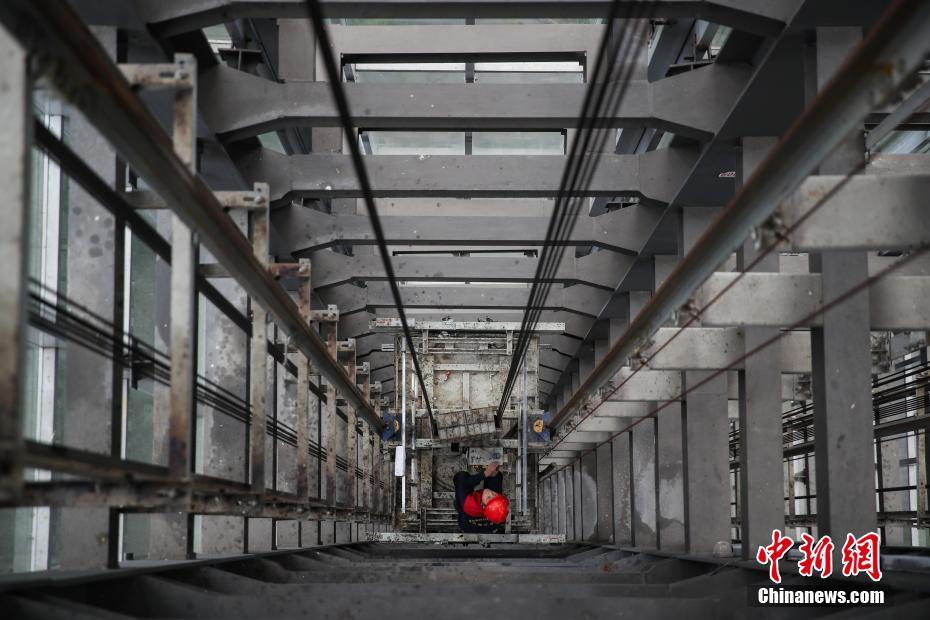 1月20日,维保人员杜安文在电梯井道检修。织金大峡谷景区位于贵州省毕节市织金县,为方便游客观光游览,景区于2014年修建了垂直高差108米的观光电梯。春节临近,织金大峡谷景区即将进入春节游高峰期,为确保旅游接待安全有序,景区加大对观光电梯的安全检查和维护保养。工作中,维保人员对机房、井道、轿门、轿顶等30多个项目进行逐一检查,排除故障隐患,保障观光电梯的运行安全。中新社记者 瞿宏伦 摄