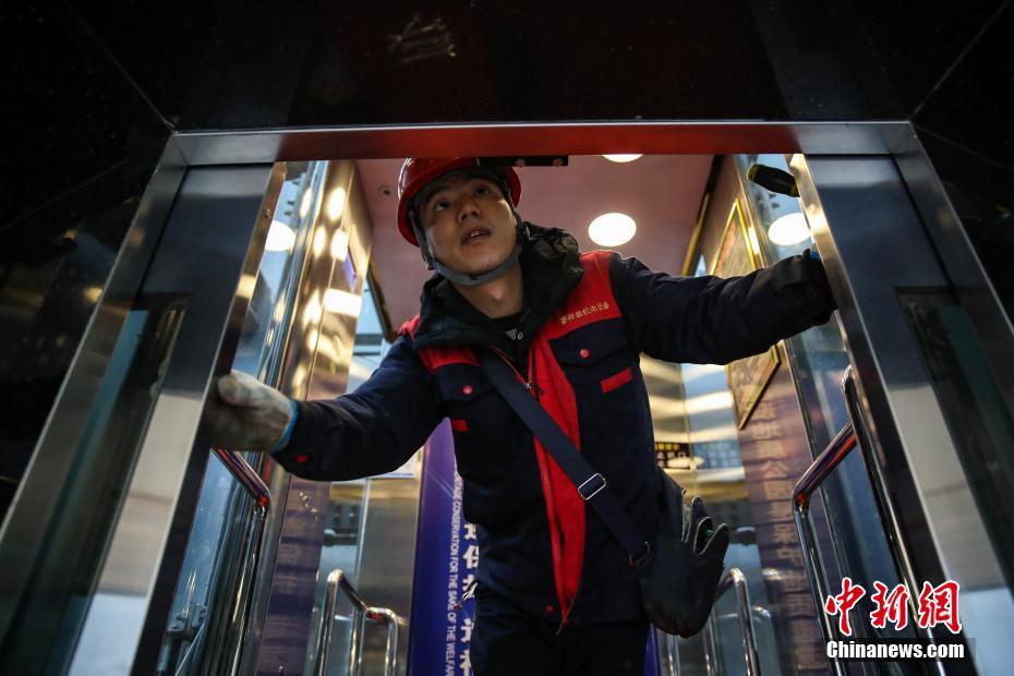 1月20日,维保人员李发江在检修电梯轿门。织金大峡谷景区位于贵州省毕节市织金县,为方便游客观光游览,景区于2014年修建了垂直高差108米的观光电梯。春节临近,织金大峡谷景区即将进入春节游高峰期,为确保旅游接待安全有序,景区加大对观光电梯的安全检查和维护保养。工作中,维保人员对机房、井道、轿门、轿顶等30多个项目进行逐一检查,排除故障隐患,保障观光电梯的运行安全。中新社记者 瞿宏伦 摄