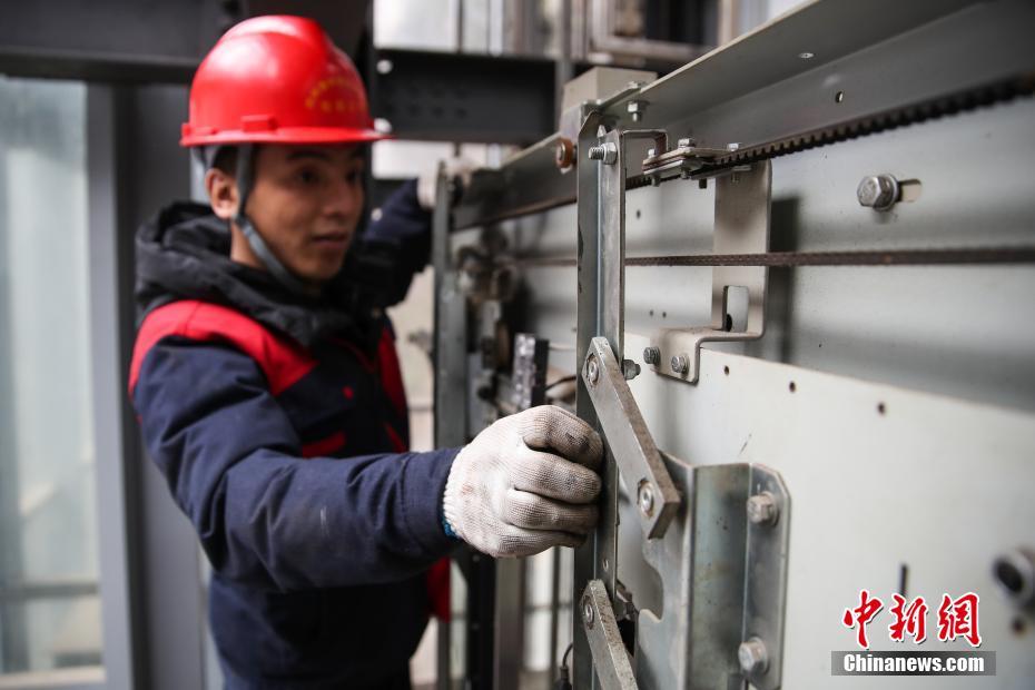 1月20日,维保人员李发江在检修电梯轿门。织金大峡谷景区位于贵州省毕节市织金县,为方便游客观光游览,景区于2014年修建了垂直高差108米的观光电梯。春节临近,织金大峡谷景区即将进入春节游高峰期,为确保旅游接待安全有序,景区加大对观光电梯的安全检查和维护保养。工作中,维保人员对机房、井道、轿门、轿顶等30多个项目进行逐一检查,排除故障隐患,保障观光电梯的运行安全。中新社记者 瞿宏伦 摄