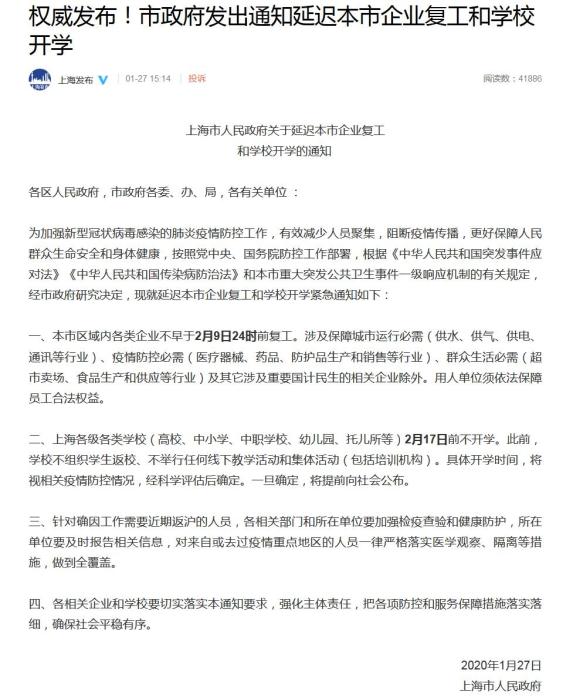 中新网1月27日电 据上海市政府新闻办公室官方微博消息,上海市政府发出通知,延迟企业复工和学校开学。通知指出,上海市区域内各类企业不早于2月9日24时前复工,上海各级各类学校(高校、中小学、中职学校、幼儿园、托儿所等)2月17日前不开学。
