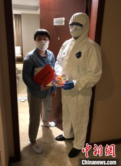 30日下午,两名酒店服务人员穿着防护服把蛋糕和贺卡送到了王婷的门前。由于隔离期不便近距离接触,卞小姐随后在前台接通了王婷的房间电话。“您好,王女士,祝您生日快乐,在这个特殊的日子里,我们希望能给您留下一个美好的回忆,享受我们送来的蛋糕。”