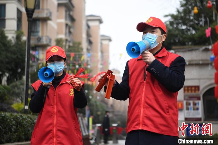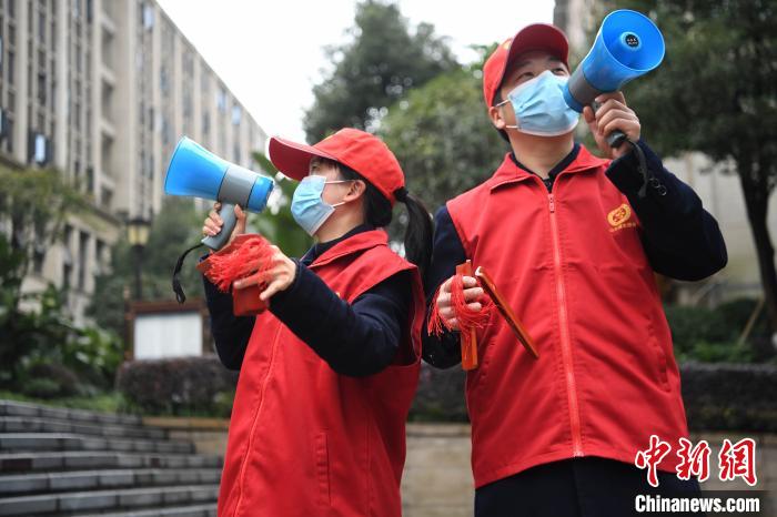 2月3日,重庆两江新区金山街道金湖社区的志愿者正在一小区内宣传防疫知识。为宣传正确的防疫知识,当地金湖社区志愿者自编防疫顺口溜,一只手拿着喊话喇叭,一只手打着快板,穿梭在社区内呼吁民众共同努力,抗击疫情。