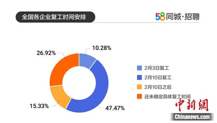 中新网客户端北京2月10日电(记者 吴涛)10日,58同城招聘发布的复工大数据报告称,受疫情影响,47%的企业在2月10日复工,15%的企业在2月10日以后复工,仍有27%的企业还未确定复工时间。
