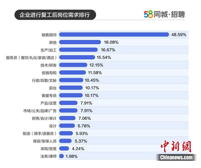 调研数据还显示,48.59%的企业复工后最先招聘销售类岗位,生产/加工类岗位、餐饮/礼仪/家政/酒店服务员岗位也是企业招聘的重点岗位。求职者择业机会主要存在于生产和生活服务业领域,复工后的就业形势仍然比较乐观。
