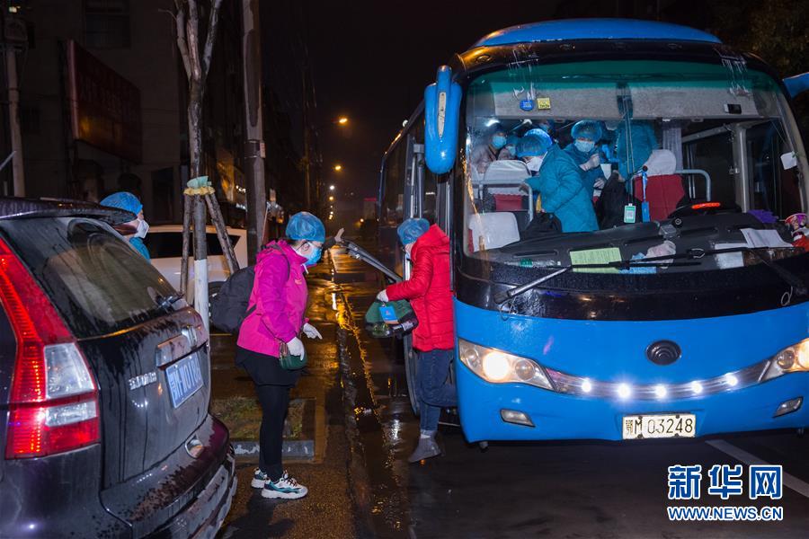 2月14日晚,山西省对口支援湖北仙桃医疗队队员抵达仙桃。新华社发(王克荣)摄