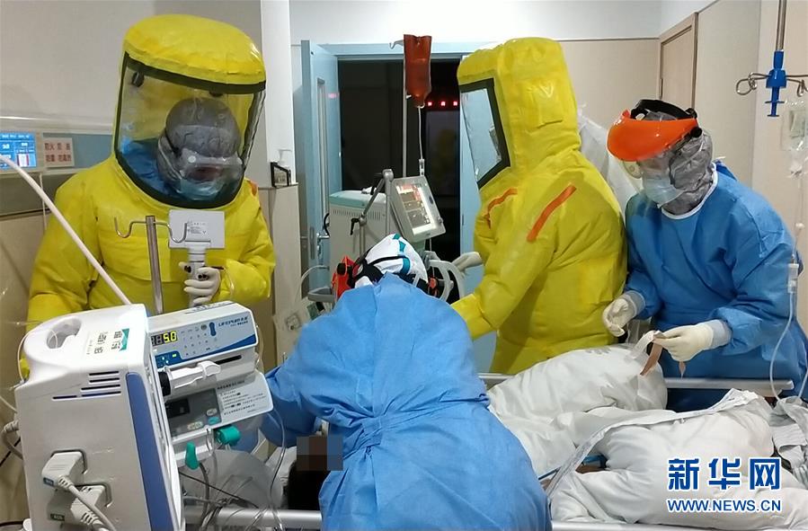 2月11日,在武汉同济医院中法新城院区ICU病房内,来自北京协和医院的医护人员在病床旁查房交班。 新华社发