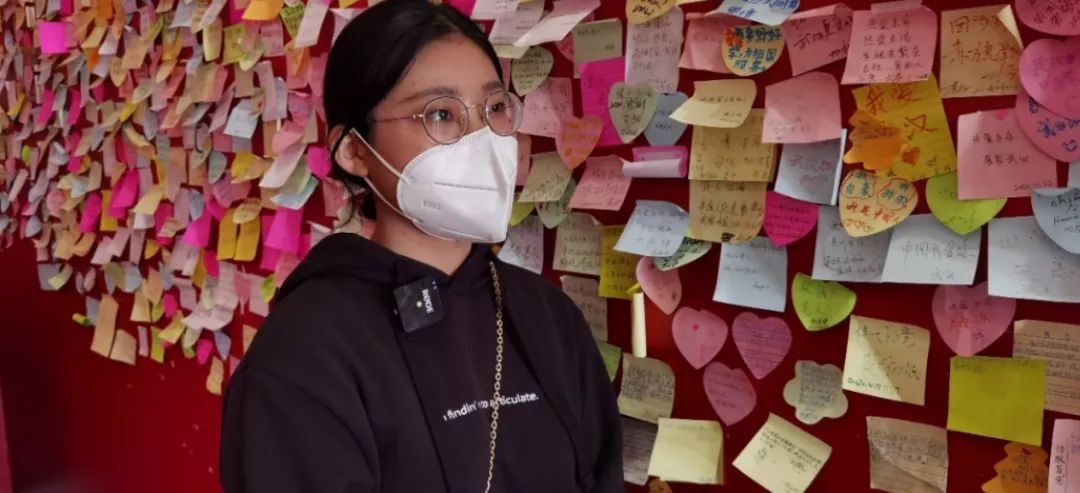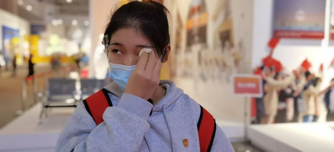 孙向未,来自山东日照市,留学韩国延世大学,飞回国内后在武汉隔离。解除隔离第二天,她来观看展览,留下了眼泪.。