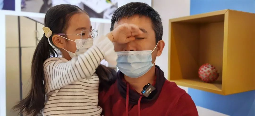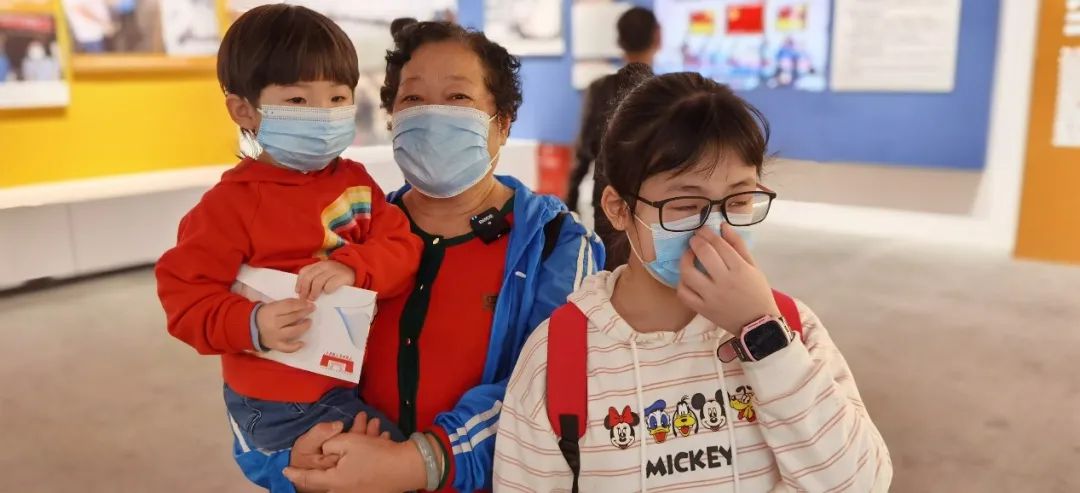 贵州省第二批援鄂医疗队护士长杨帅君,携妈妈、女儿、爱人及队友王丽前来观展。其大女儿在展览现场看到妈妈工作过的复原场景,忍不住流下了流泪。