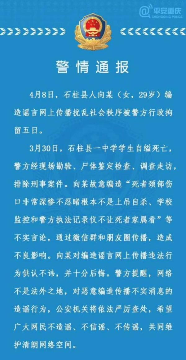 (原题为《石柱中学生自缢死亡案造谣者被行政拘留》)