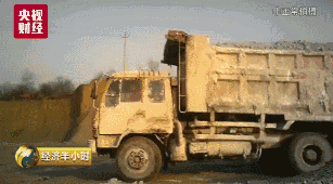 伴随着发动机的轰鸣声,卡车的后斗被抬起,一整车白色工业废渣被倾倒在一个巨大的深坑里,灰色和白色两种工业废渣沿着卡车停过的位置滚落至坑底,从远处看,好似两种不同颜色的“瀑布”。