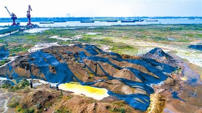 占地百余亩的强碱工业固废堆放江边,有毒有害淋溶水可直流长江;选矿尾渣直接倾倒长江,江水冲洗三年仍存数吨;园内名企半夜户外开工,释放挥发性有毒气体……这是记者3月下旬蹲点暗访安徽省级“循环化改造示范试点”——安徽贵池前江工业园发现的现象。当地村民反映,园内如此污染行为已非一天两天,曾多次被环保部门要求整改,仍屡禁不止。安徽省委省政府目前已紧急部署相关部门对此进行专项治理。这是3月27日用无人机拍摄的贵池前江工业园的长江沿线码头——海易物流园内堆积的不明固废。新华社发