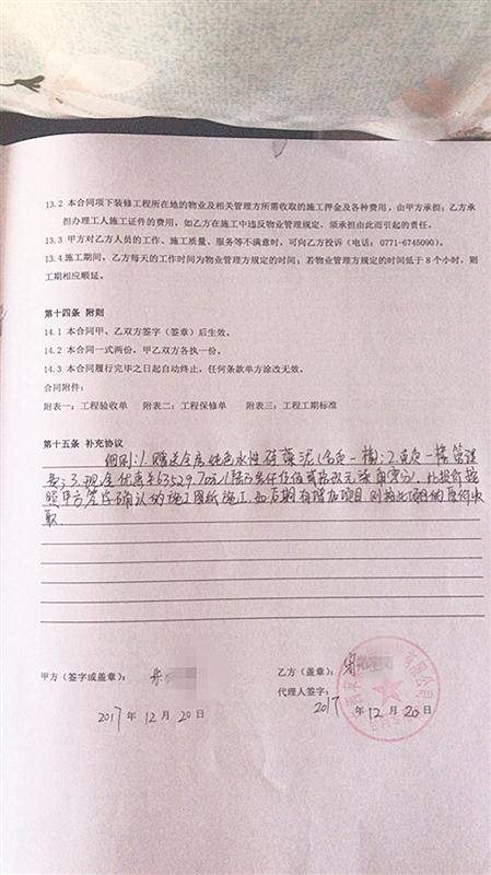谢先生在云景路附近某小区购买一套毛坯房,随后通过网上寻找装修公司。“我浏览苹果装饰公司的网站后,通过电话等途径沟通,感觉他们比较正规。”谢先生说,这家公司在全国有不少店面(分公司),信誉和资质应该很靠谱。