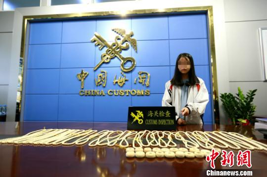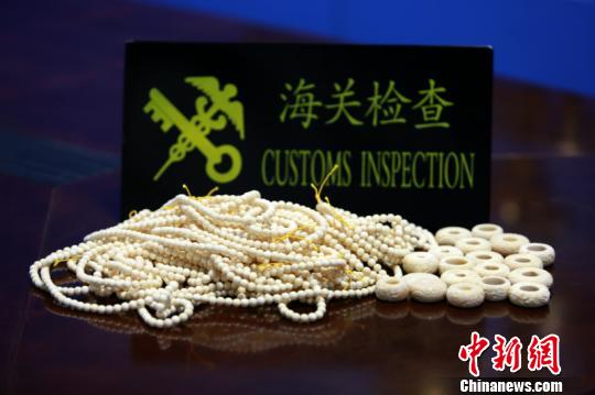 海关人员当即叫住阿玄,示意她接受检查,随即在其腰腹部位查获缠缚物品。经清点查验,全是象牙制品,包括30条串珠和19个环状雕刻品,共计2067.7克。