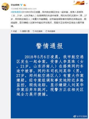 中新网5月10日电 据郑州市公安局官方微博消息,5月6日,郑州市航空港区发生一起命案,受害人李某珠(女,21岁,山东济南人)在搭乘网约车途中被害,今天晚上,郑州市公安局通报了案情进展。警方表示,嫌疑人刘某华有重大作案嫌疑,作案后弃车跳河,现警方正在相关区域全力展开搜捕。