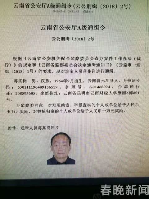 5月11日,云南省公安厅发布A级通缉令,西南林业大学党委副书记、校长蒋兆岗潜逃被通缉。通缉令公布了蒋兆岗的身份证号码、护照号码和大陆居民往来台湾地区通行证号码。同时宣布,经监察委同意,对发现线索、举报查实的个人或单位,奖励人民币5万元;对抓捕归案的个人或单位,奖励人民币10万元。