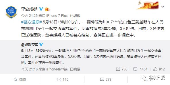 5月13日18时20分许,一辆牌照为川A7****在人民东路路口发生一起交通事故案件,此事故造成3车受损,3人轻伤。目前,3名伤者已送往医院,肇事嫌疑人已被警方控制,案件正在进一步调查中。