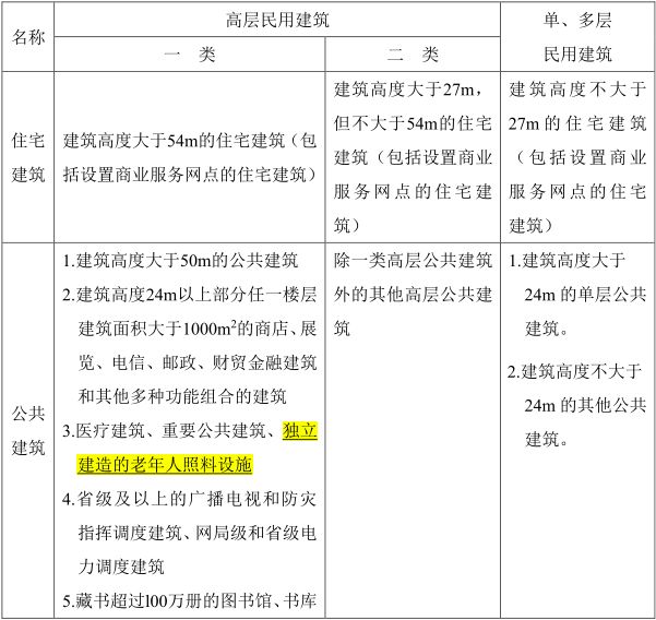 5.1.1 民用建筑根据其建筑高度和层数可分为单、多层民用建筑和高层民用建筑。高层民用建筑根据其建筑高度、使用功能和楼层的建筑面积可分为一类和二类。民用建筑的分类应符合表5.1.1的规定。