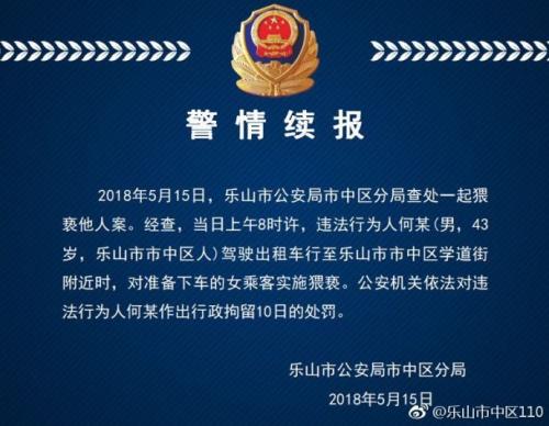 中新网5月15日电 就四川乐山一出租车司机拉女乘客领口欲袭胸一事,四川省乐山市公安局市中区分局官方微博发布最新消息称,公安机关依法对违法行为人何某作出行政拘留10日的处罚。