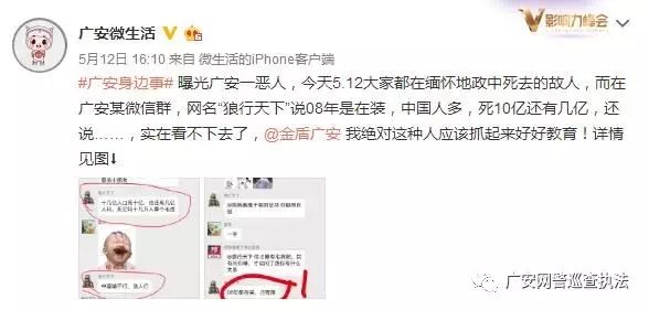 中国青年网北京5月24日电今年5月12日是汶川地震十周年纪念日。当天,四川省广安市广安区网民张某某却在微信群中发表侮辱地震受难者言论。据广安网警巡查执法微信公众号日前发布的信息,张某某迫于压力于5月21日主动投案,被广安区公安分局处以行政拘留15日。