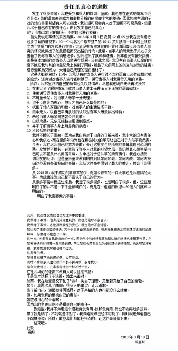 3月16日,科里斯的父母向豆芽短信致歉:“我们对他(科里斯)的教育和关心太少导致他的狂妄,对您的生活造成影响再次向您道歉。”