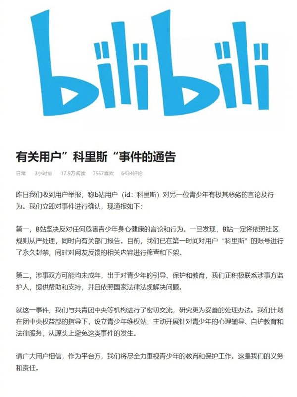 3月12日,B站发布有关用户“科里斯”事件的通告