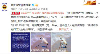人民网北京6月7日电 (记者孝金波)6日,山东临沂兰山警方依法行政拘留一名散布虚假信息扰乱公共秩序的网民。