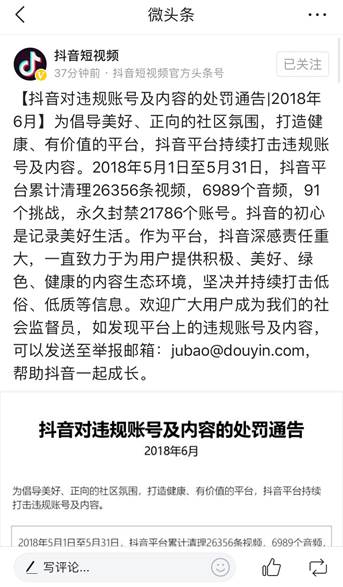 自2018年4月以来,抖音每月都会发布一次处罚通告。这被视为抖音正在积极推进平台治理的表现。正如抖音官方在通告中称,此举是“为倡导美好、正向的社区氛围,打造健康、有价值的平台”。